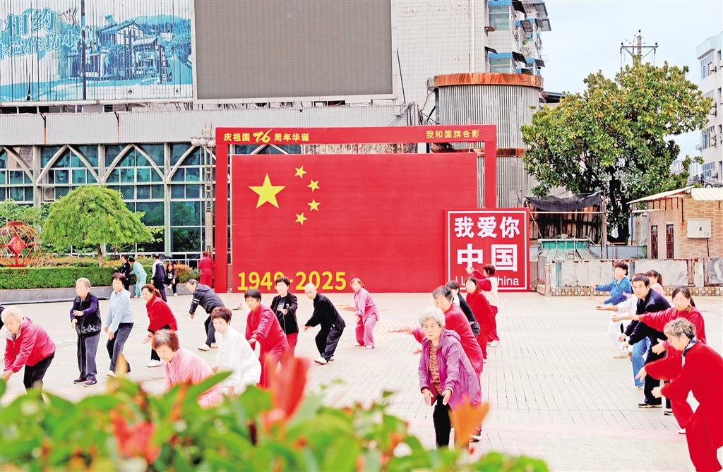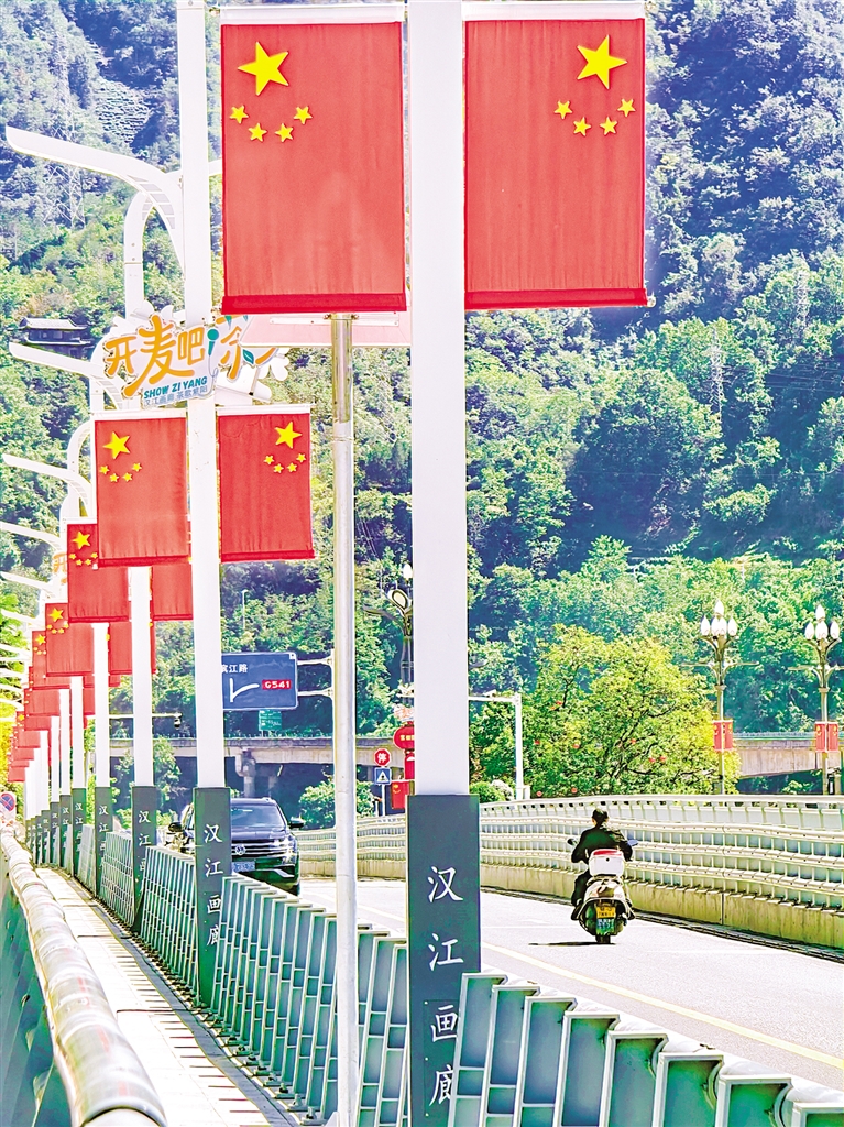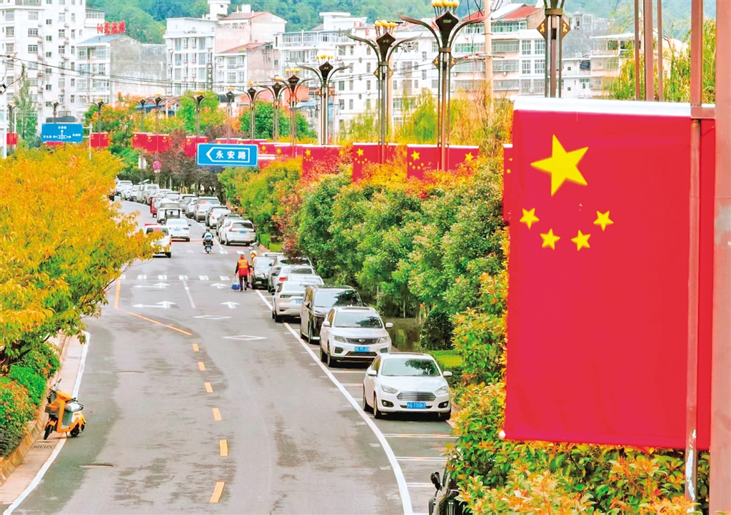 紫陽城區的街頭巷尾,一面面鮮艷的五星紅旗迎風招展,處處洋溢著祥和的節日氛圍。?葉明星 攝