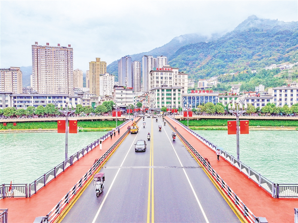 在嵐皋縣大橋兩側,一面面整齊的五星紅旗迎風飄揚,喜迎國慶。?李王灝 攝