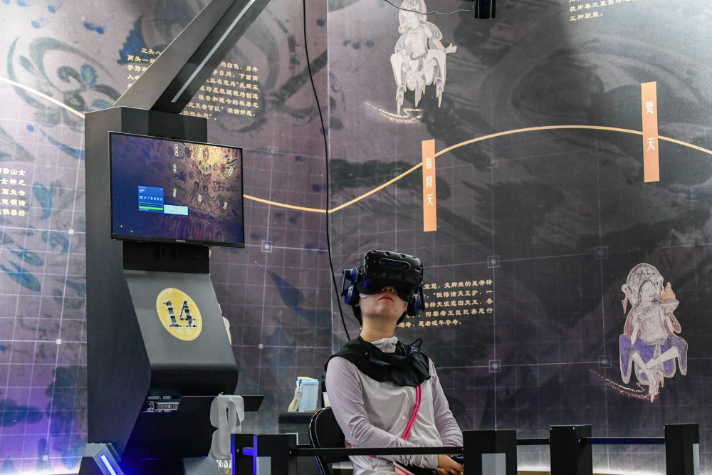 2024年7月22日,游客在“尋境敦煌——數字敦煌沉浸展”借助VR設備沉浸式游覽莫高窟第285窟虛擬場景。“尋境敦煌——數字敦煌沉浸展”綜合運用VR虛擬現實、三維建模、游戲引擎的物理渲染和全局動態光照等新技術,高精度立體還原了莫高窟第285窟。游客戴上VR眼鏡,不僅可以零距離觀賞壁畫、360度自由探索洞窟細節,還能“飛升”到窟頂,身臨其境參與壁畫故事情節,沉浸式感受敦煌文化的魅力。