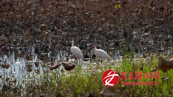 近日,漢陰縣雙乳鎮千畝荷塘再次迎來朱鹮群,潔白的羽毛與艷紅頭冠在秋日陽光下格外靈動,一派安逸自在的景象,繪就人與自然和諧共生的生動畫卷。(通訊員 黃智發)