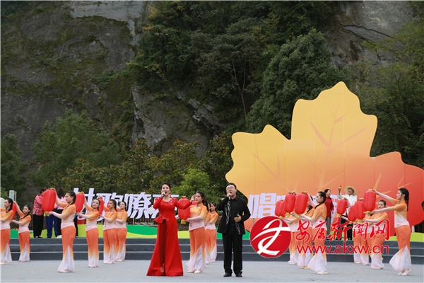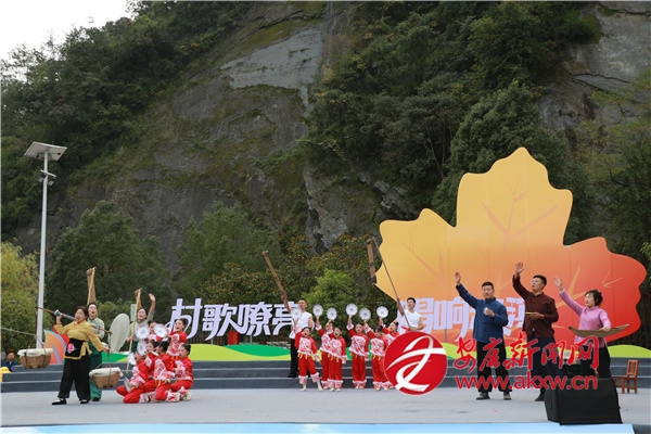 金秋時(shí)節(jié)的茨溝鎮(zhèn),萬畝紅葉、層林盡染。伴隨著歡快的鑼鼓聲,茨溝鎮(zhèn)、五里鎮(zhèn)、譚壩鎮(zhèn)三支隊(duì)伍輪番登場(chǎng),不僅獻(xiàn)唱原創(chuàng)村歌,還展示特色產(chǎn)業(yè)、優(yōu)質(zhì)資源與地方文化,紛紛亮出獨(dú)具特色的“看家絕活兒”。歌伴舞《村歌飛揚(yáng)》《松壩謠》《幸福歌兒唱起來》唱出了鄉(xiāng)親們的幸福生活;以修建八一水庫(kù)為背景的安康歌謠《我來了》引發(fā)會(huì)場(chǎng)共鳴;民俗表演《龍的傳人》則將節(jié)目推向高潮。舞蹈、鄉(xiāng)村T臺(tái)秀、民俗表演、八岔戲等節(jié)目,或以傳統(tǒng)幽默詼諧的風(fēng)格,或以深情敘述的方式,展現(xiàn)鄉(xiāng)村新生活,為觀眾獻(xiàn)上一場(chǎng)別開生面的視聽盛宴,現(xiàn)場(chǎng)歡呼聲此起彼伏。