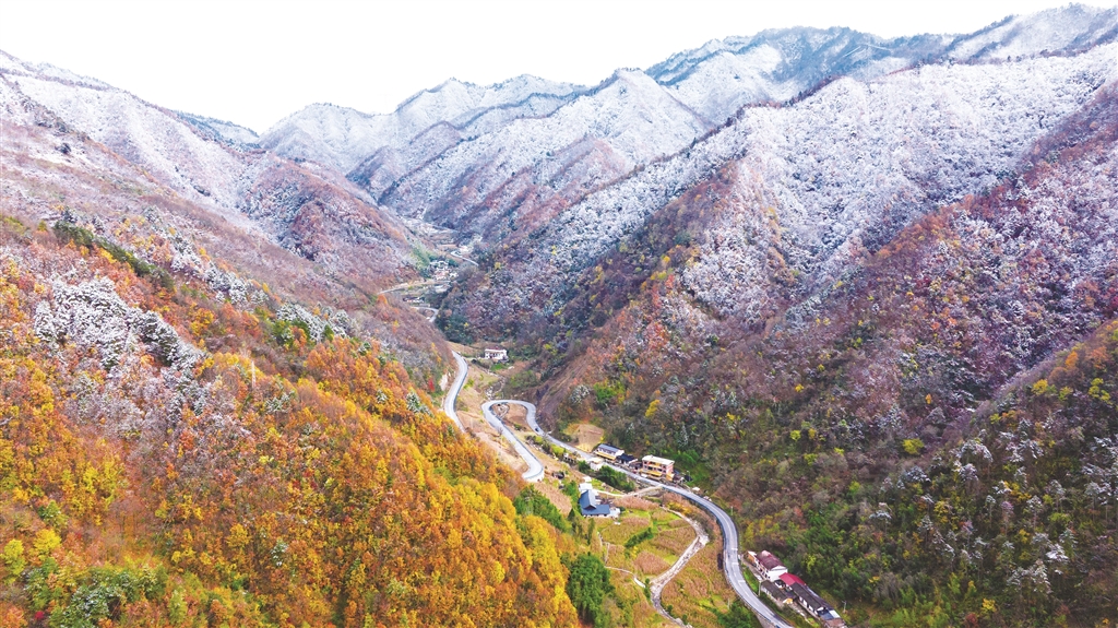 車子繼續向前,離寧陜越來越近時,車窗外那片銀裝素裹的童話世界竟悄悄退場,再次將五彩斑斕鋪展開來。楓紅未減,葉黃依舊,深綠的枝葉間還凝著點點雪色,像是剛從時光隧道走出一般。陽光不知何時鉆出了云層,照在未化的雪上,泛起細碎的晶瑩。這時的山野,既有秋的飽滿,又有冬的清澈,仿佛一場盛大的交接正在無聲進行,秋不忍盡褪其色,冬亦不忍驟掩其華,于是二者相融,成就了這短暫而珍貴的相遇。