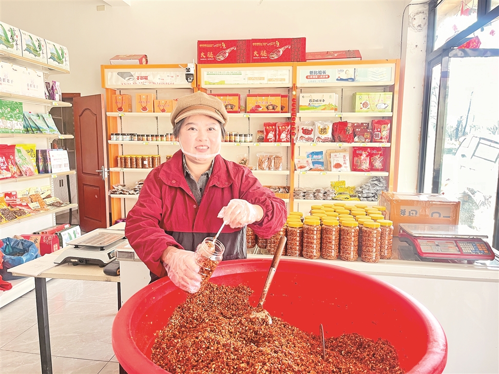 生意有了起色,丈夫的身體也逐漸康復,生活終于重新亮堂起來。作為鎮人大代表,劉小洪深知,一人富不算富,大家富才是真的富。她主動分享直播帶貨經驗,帶動周邊村民參與特產加工和網絡銷售。她優先聘請村里的留守婦女和困難家庭來幫忙,手把手教她們技術。為了保證產品的純正鄉味,她堅持從本村及周邊村采購黃豆、辣椒、野油菜、干豇豆等原材料,平均每年收購約1萬公斤黃豆、2000余公斤辣椒、2000余公斤野油菜及干豇豆,讓鄉親們的農產品有了穩定銷路,也變成了實實在在的收入。