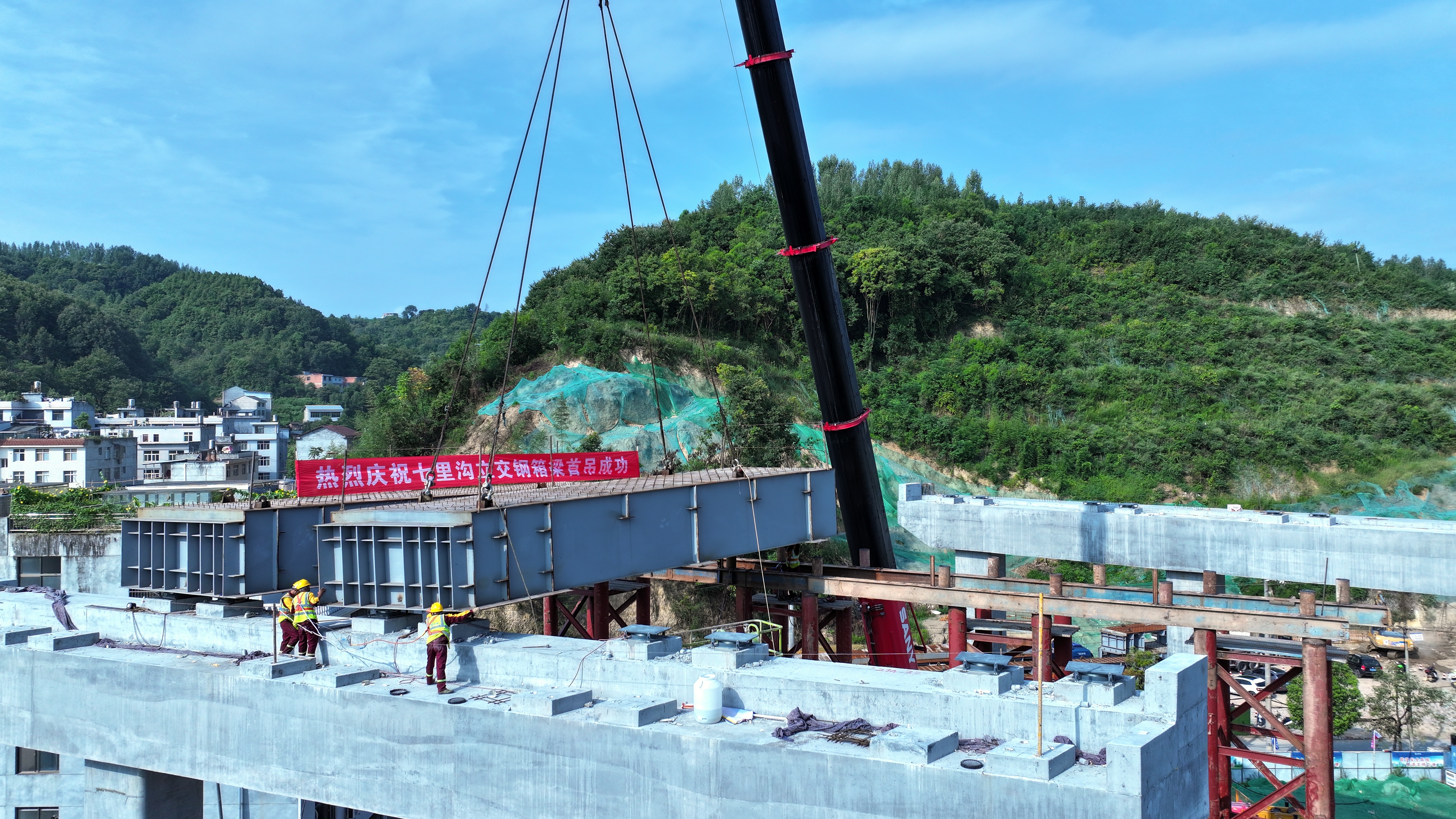 2024年8月8日,七里溝立交首榀鋼箱梁架設(shè)完成。