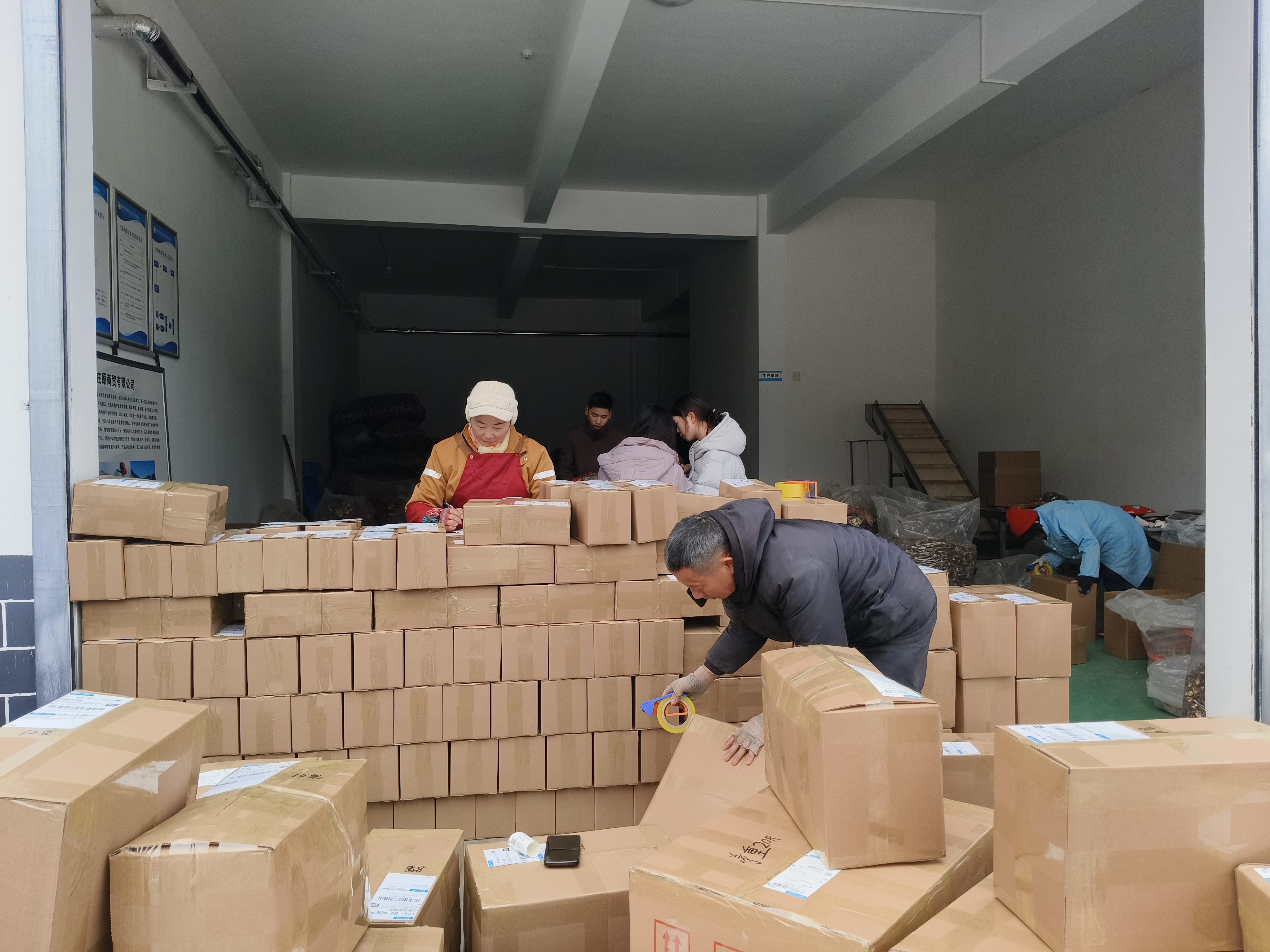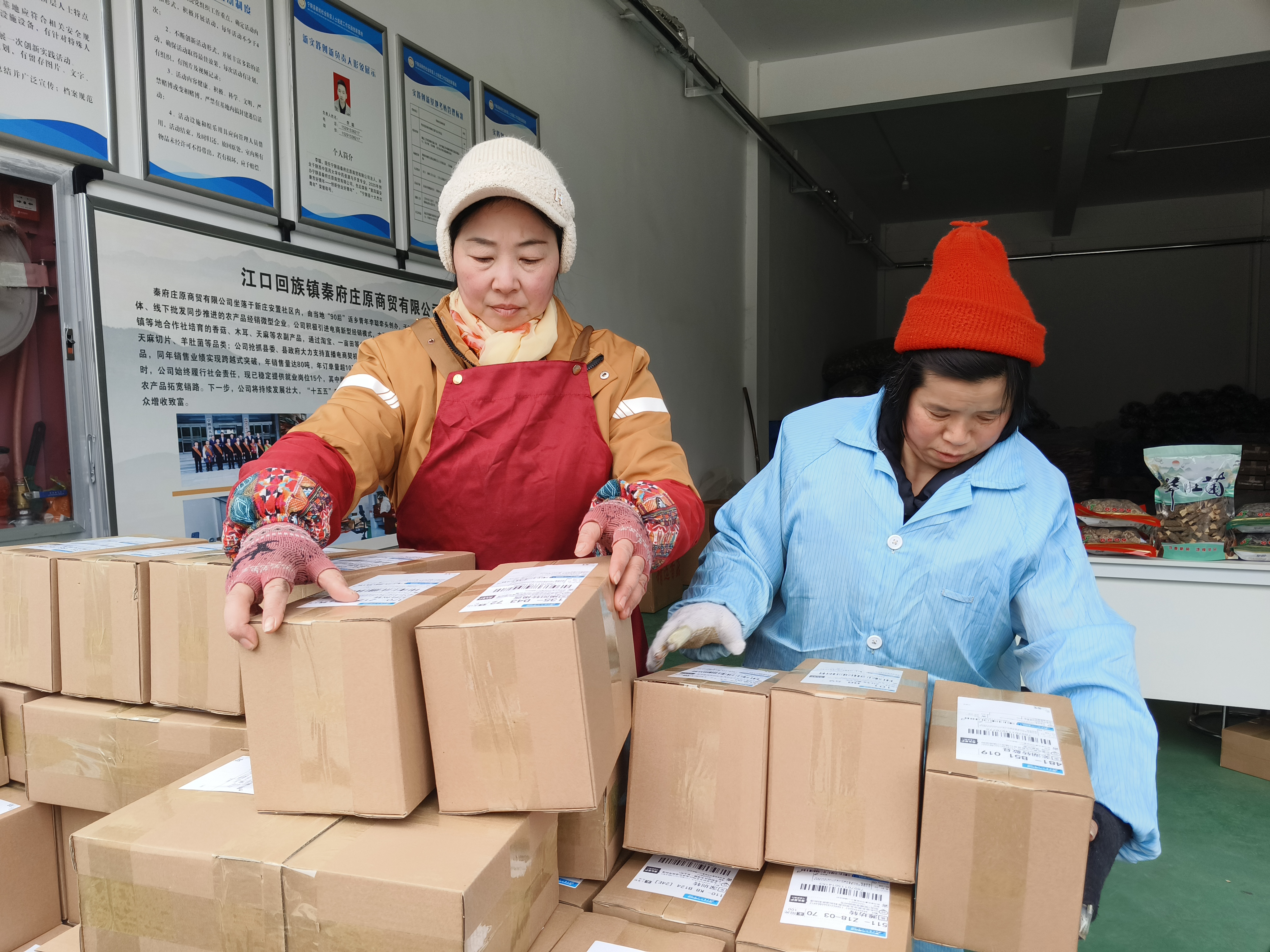 春節前夕,寧陜縣江口回族鎮秦府莊原商貿有限公司內一片繁忙,工人們忙著打包、發貨。近期,寧陜山珍線上銷量持續走高,日均發貨約700單。(劉長兵 攝)