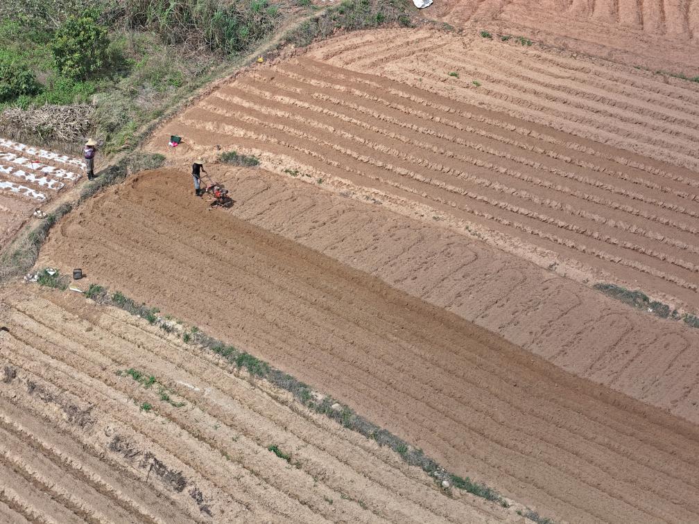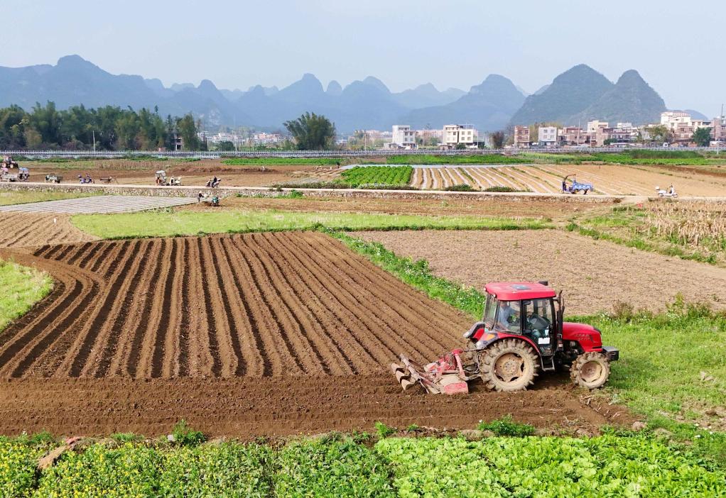 近日,廣西來賓市忻城縣城關鎮都樂村農民駕駛農機在翻耕田地,準備種植玉米(無人機照片)。一年之計在于春,各地人們忙著翻耕土地、培育秧苗、檢修農機、裝運化肥,為春耕生產做準備。新華社發(樊紹光 攝)