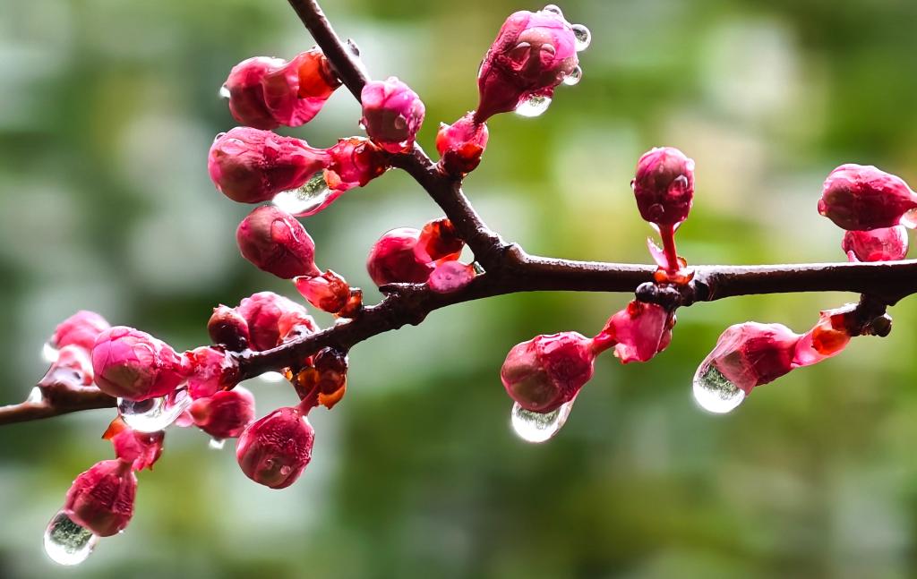 這是3月1日拍攝的河南省洛陽市街頭花苞上的露珠。一場春雨過后,晶瑩剔透的雨珠綴滿枝頭,勾勒出別樣春日景致。新華社發(高山岳攝)