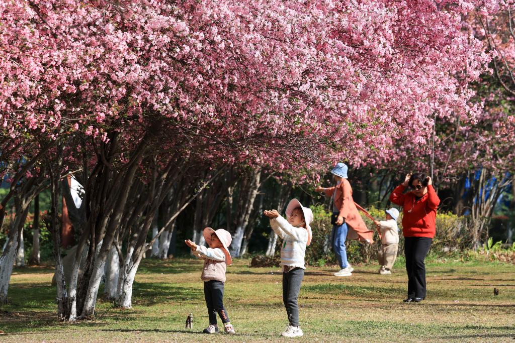 近日,游客在云南省曲靖市沾益區玉林廣場海棠花樹下賞景游玩。新華社發(孫文來攝)