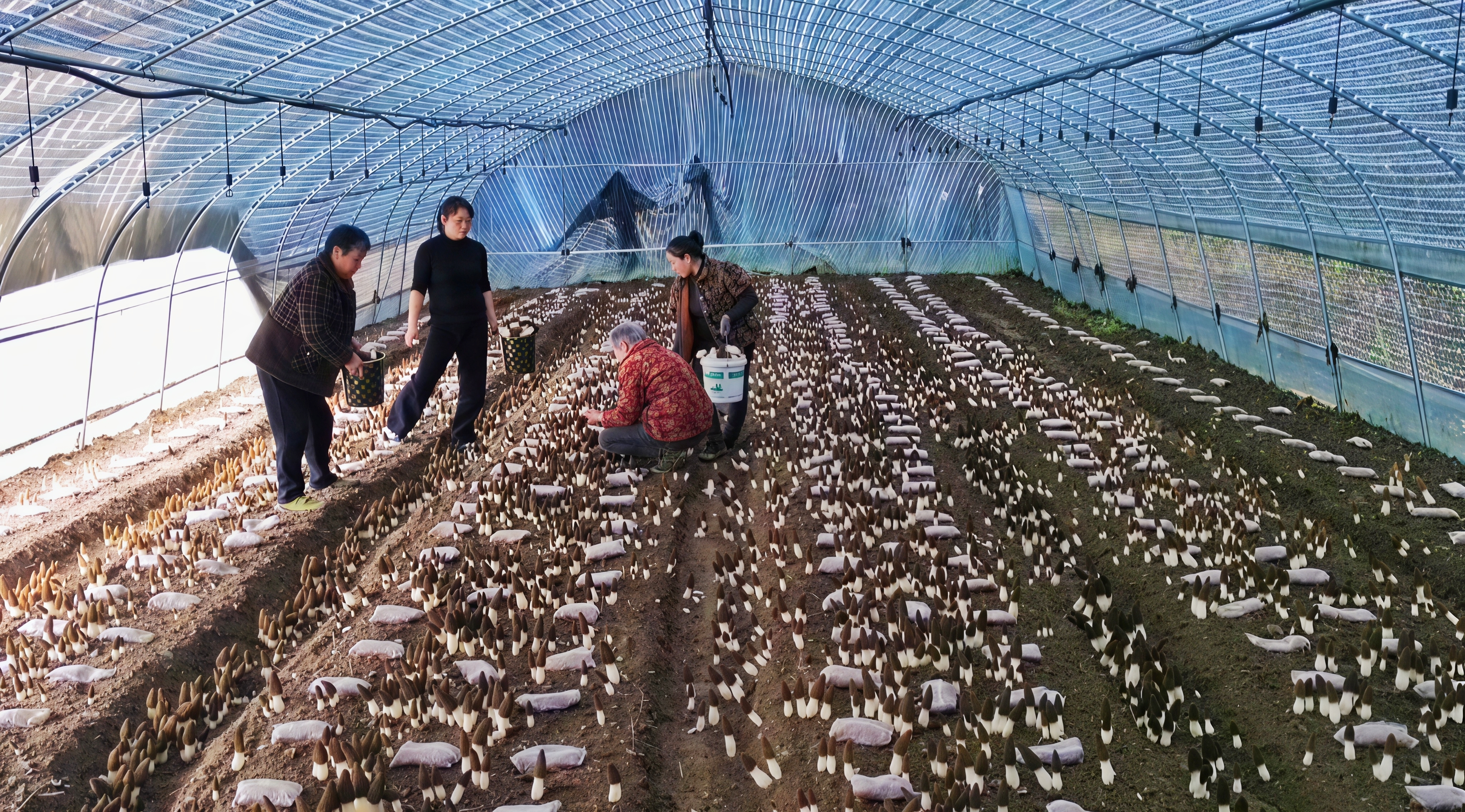 在大雁村羊肚菌種植基地,50畝羊肚菌進入集中采收期。整齊排列的大棚內,一朵朵形態飽滿的羊肚菌破土而出,褐色菌蓋紋理清晰,長勢喜人。村民們手持小刀,小心翼翼采收著被譽為“菌中之王”的珍貴食材。羊肚菌采用“冬播春收”模式,生產周期短、經濟效益顯著。按當前長勢,預計畝產鮮菇可達400公斤,畝產值超3萬元,真正實現“春收”變“增收”。
