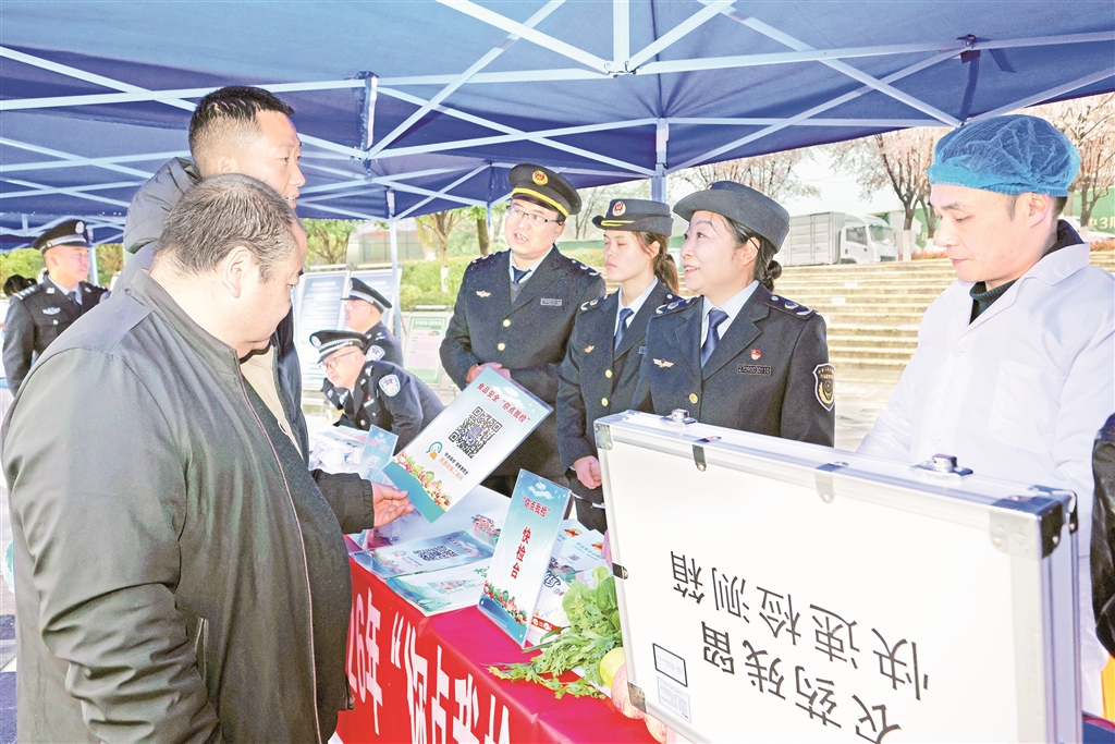 3月14日,在2026年陜西省“3·15”國際消費者權益日主題活動暨安康市“3·15”集中宣傳活動中,市場監管執法人員正在宣傳講解農殘監測。