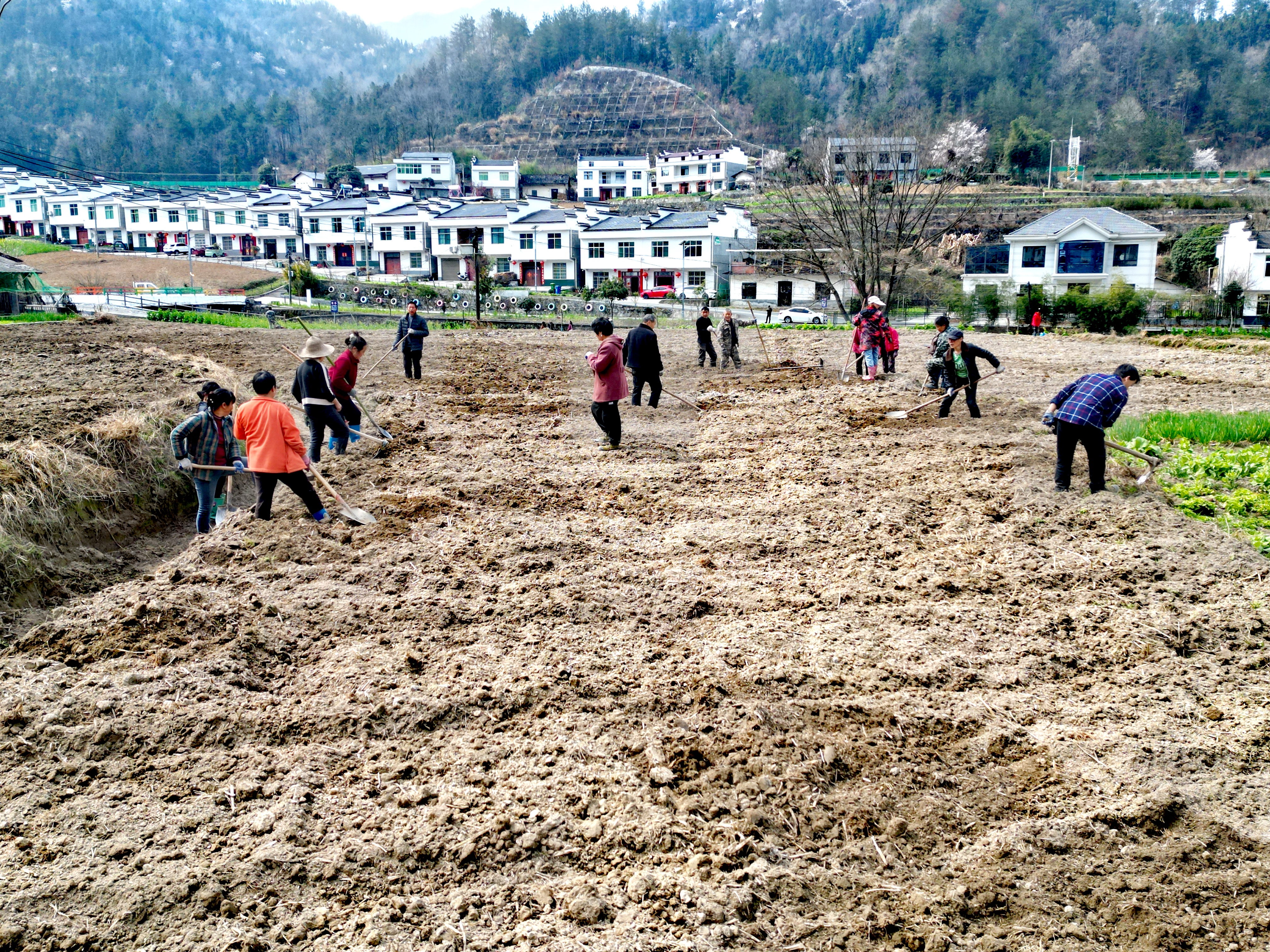 3月5日,走進廣佛鎮八角廟村絞股藍基地擴建現場,拖拉機在田間來回穿梭,有序開展翻耕、碎土、平整作業;村民們緊隨其后,手持農具整地、施肥、抽廂、打窩、播種、覆土,田間地頭一派如火如荼的春耕景象。