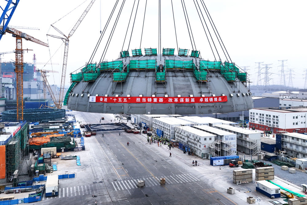 2026年2月10日在遼寧省葫蘆島市拍攝的徐大堡核電站1號機組核島鋼制安全殼頂封頭吊裝作業現場(無人機照片)。新華社發