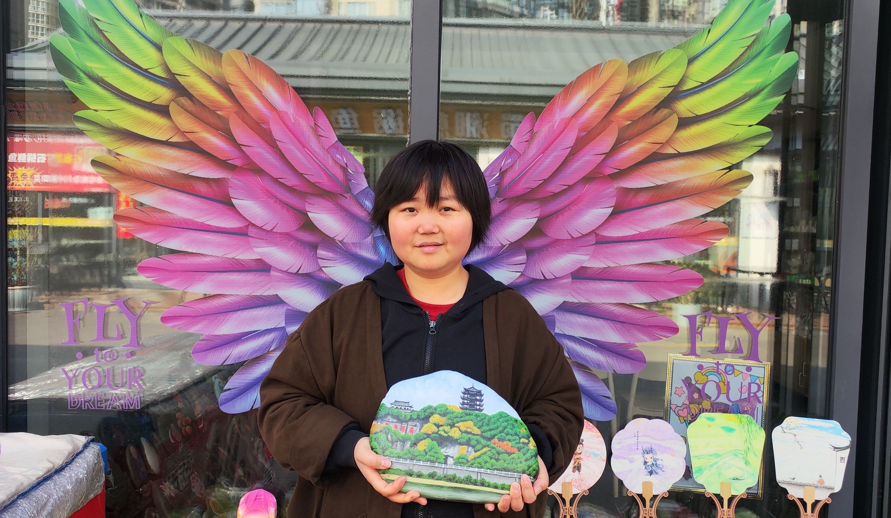 在她店鋪門口的玻璃柜上,貼著一雙展開的彩翼,手捧石頭畫的李景麗,眼神明亮、笑容溫婉,恰似破繭重生的蝴蝶,歷經風雨洗禮,依舊振翅翱翔,用手中的畫筆續寫著屬于自己的芳華,也用堅韌與熱愛,詮釋著新時代普通人不屈不撓、逐光前行的精神力量。