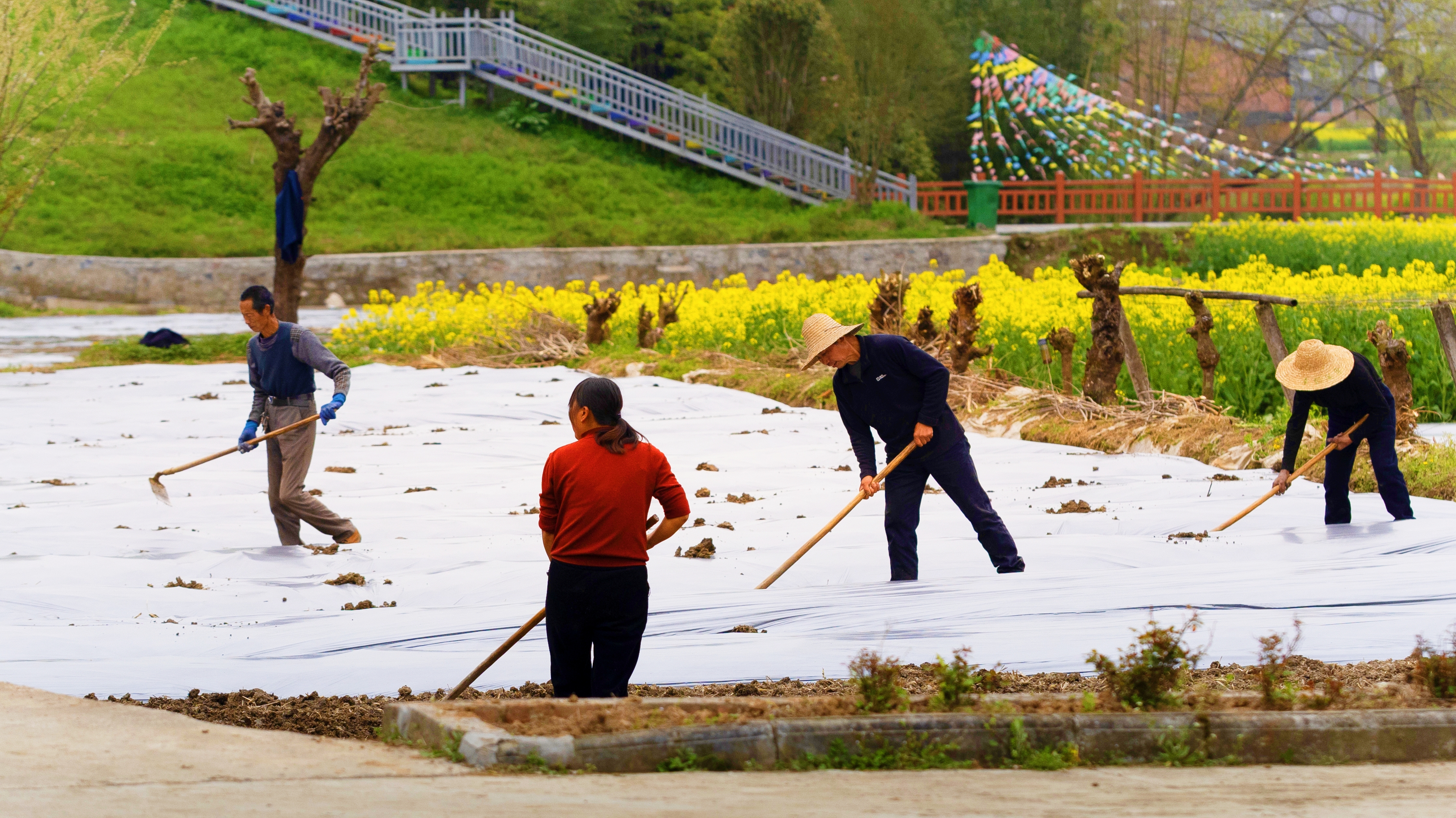 花海之上風光旖旎,花海之下農事正忙。趁著晴好天氣,當地農戶搶抓春耕有利時節,田間地頭一派熱火朝天的忙碌景象。大家分工協作、有條不紊,忙著起壟整地、鋪設地膜,為紫長茄子移栽做前期準備工作。