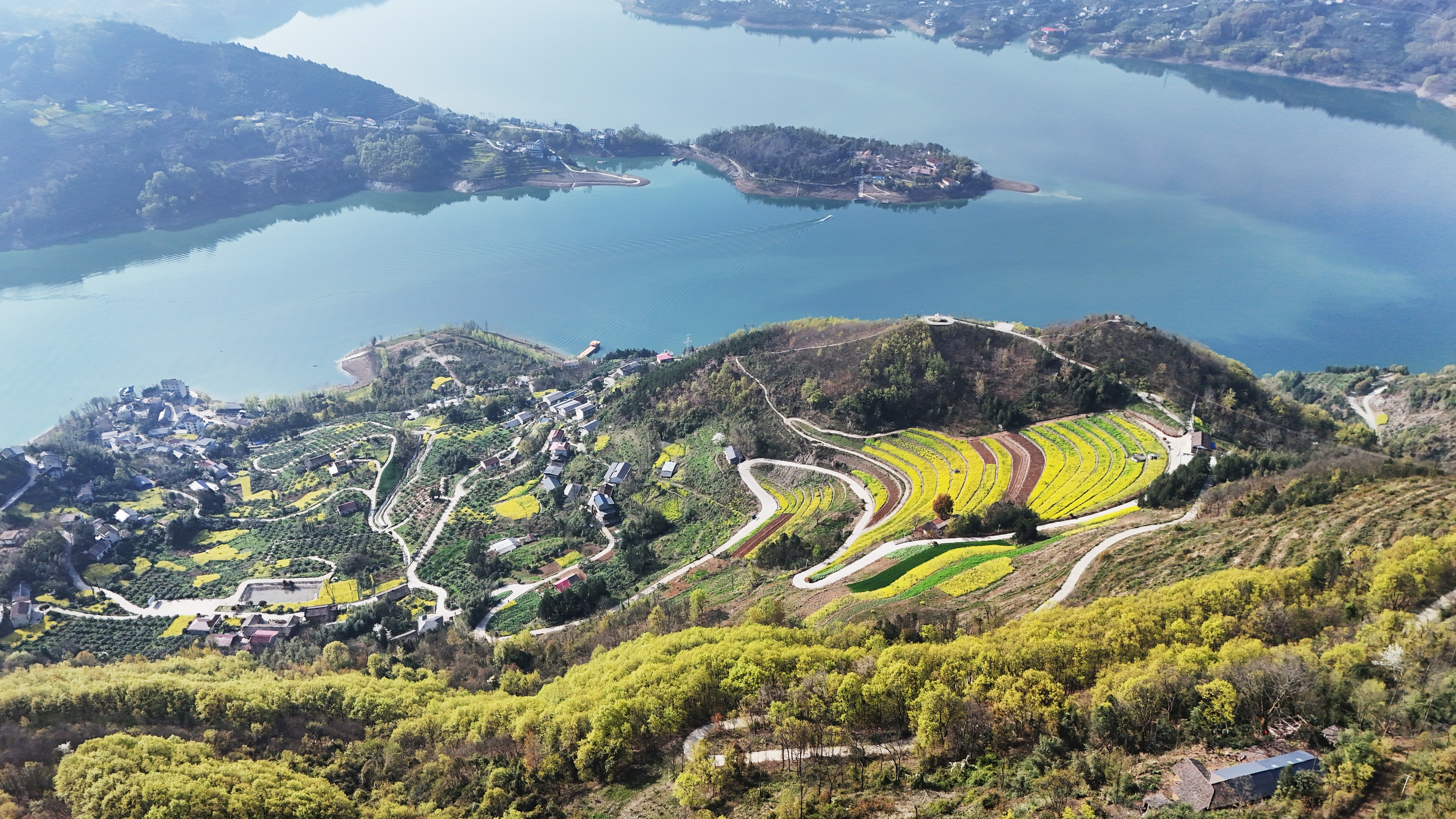 春分過后的漢江安康段沿江兩岸,桃花、櫻花、梨花、李花、油菜花等競相綻放,宛如一幅山水畫卷。圖為3月22日拍攝的漢濱區瀛湖鎮郭家河村春景。 趙華斌 攝