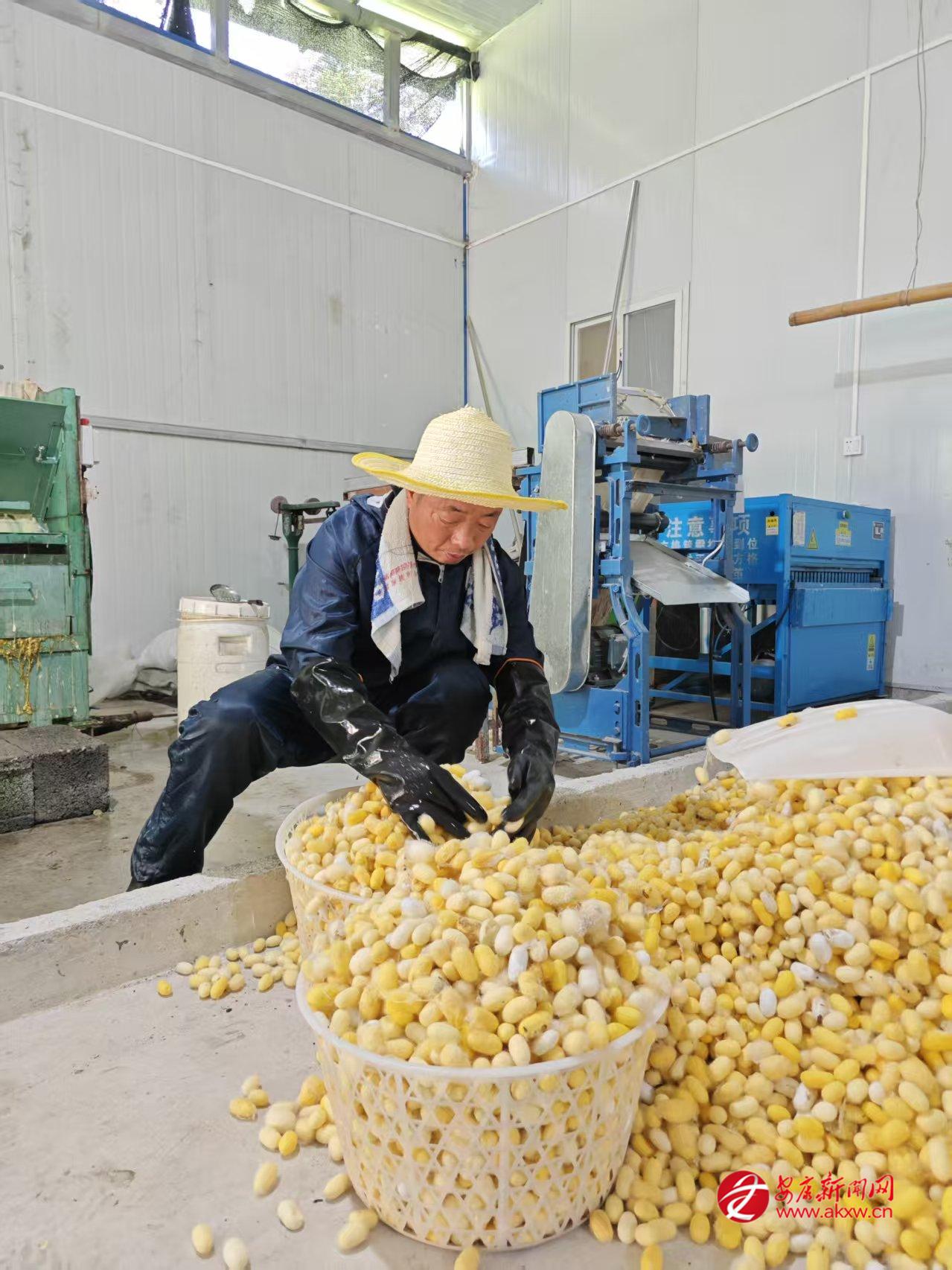 “以前養蠶全靠經驗,溫濕度把控不好,蠶繭產量低。現在有了智能設備和技術指導,養蠶更輕松,收入也更高了。”李家河村養蠶大戶王興義感慨道。作為產業帶頭人,他投資200余萬元成立家庭農場,配套建設標準化養蠶室和加工廠房,引進滑輪升降式省力化蠶臺、自動化養蠶設備,實現了從種養到加工的全鏈條升級。