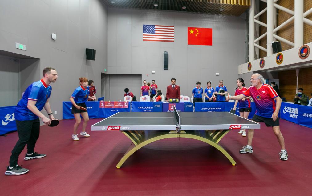 2021年4月10日,上海舉行紀念中美“乒乓外交”50周年系列活動。這是中美選手參加乒乓球友誼賽。新華社記者 王翔 攝