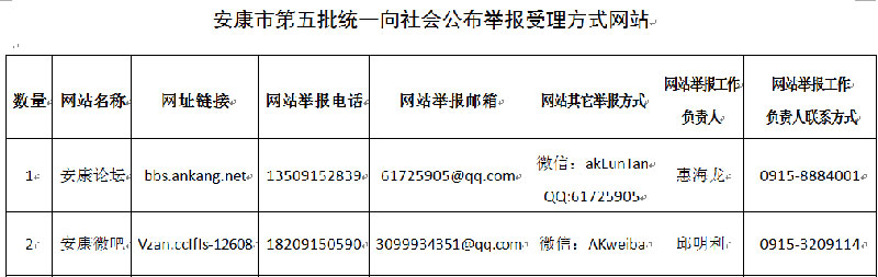 安康市第五批申報統一向社會公布舉報受理方式網站