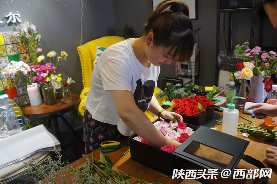 九零后花店的老板正在認真插花。