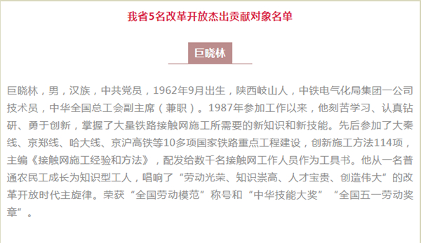 根據評選表彰工作部署,在各地區各部門反復比選、組織考察、集體研究提出推薦人選的基礎上,經歸口評審、統籌考慮,產生了100名改革開放杰出貢獻擬表彰對象。其中我省5人入選,安康1人上榜。ewW安康新聞網