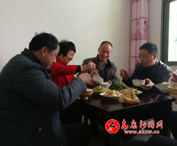 中午吃飯一般都是幾個素菜,和村上干部一起邊吃邊聊。楊先彩做過手術,飯量小,經常把飯撥給胡珂。記者 陳俊 攝