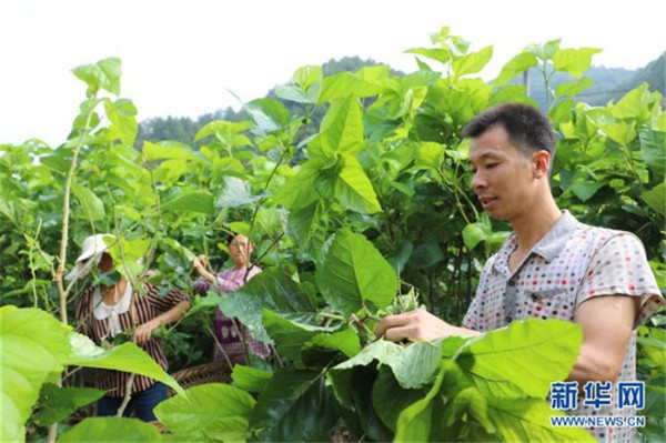 饒峰鎮新華村的養蠶戶邱紅軍(右)在自家的桑樹園內采摘桑葉(9月6日攝)。ybc安康新聞網