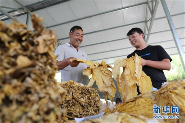 饒峰鎮齊心村永根雙帶種植專業合作社理事長華永根(左)和一名鎮干部在查看分揀好的煙葉(9月5日攝)。ybc安康新聞網