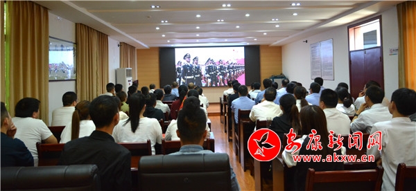 10月1日,安康市公安局組織機(jī)關(guān)民警收看慶祝中華人民共和國成立70周年大會實況轉(zhuǎn)播。(攝影 周瑞儒)