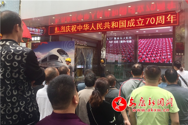 市民們觀看慶祝中華人民共和國70周年大會實況轉(zhuǎn)播。(攝影 張喬)