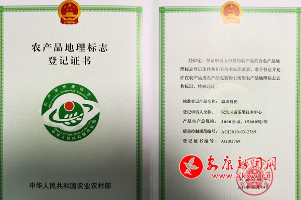 日前,農(nóng)業(yè)農(nóng)村部發(fā)布公告,漢濱區(qū)農(nóng)業(yè)農(nóng)村局蠶茶果技術(shù)中心申報的“瀛湖枇杷”經(jīng)過初審、專家評審和公示,符合農(nóng)產(chǎn)品地理標志登記條件和相關(guān)技術(shù)標準要求,準予登記,特頒發(fā)中華人民共和國農(nóng)產(chǎn)品地理標志登記證書。