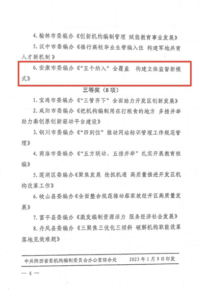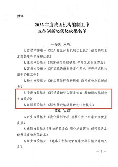 日前,2022年度陜西省機構編制工作改革創新獎評選結果揭曉,入選全省機構編制系統20項獲獎成果中,我市3項改革創新成果斬獲一等獎2名、二等獎1名,獲獎等次和數量位居全省第一。