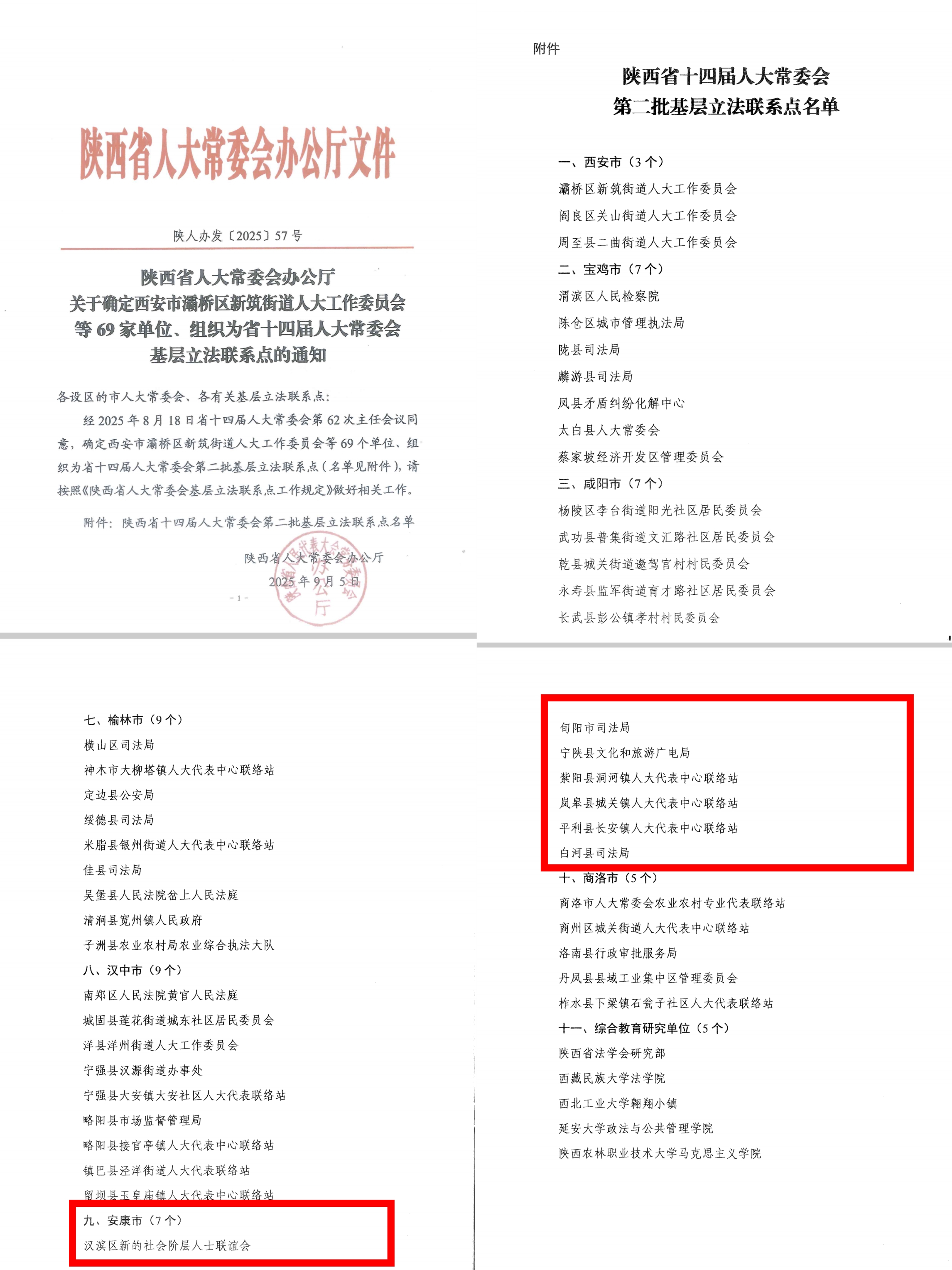 本網訊(通訊員 段文貞)9月5日,省人大常委會公布《陜西省十四屆人大常委會第二批基層立法聯系點名單》,我市漢濱區新的社會階層人士聯誼會、旬陽市司法局、寧陜縣文化和旅游廣電局、紫陽縣洞河鎮人大代表中心聯絡站、嵐皋縣城關鎮人大代表中心聯絡站、平利縣長安鎮人大代表中心聯絡站、白河縣司法局7家單位、組織成功入選。這是繼2023年省人大常委會在我市確立首批4個基層立法聯系點以來,通過綜合考核、嚴格篩選再次確立的7個基層立法聯系點,實現了全市各縣(市、區)全覆蓋。