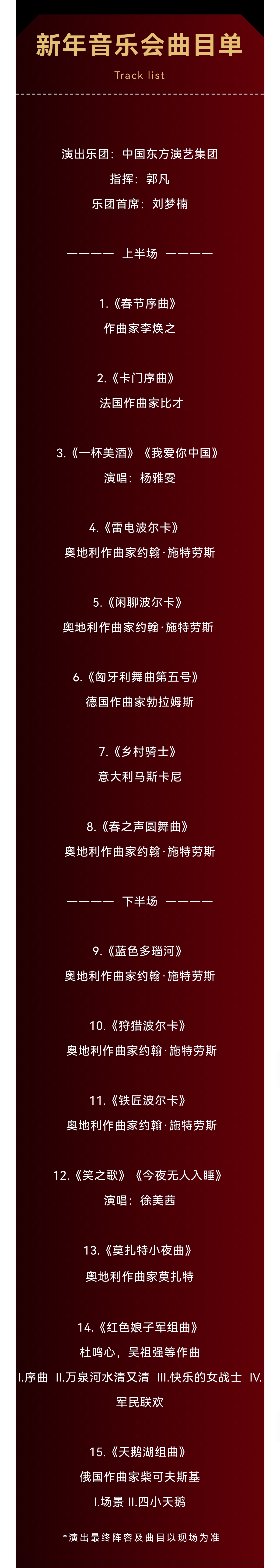 本場音樂會以“喜迎新年”為篇章,精粹二十首左右的中外“新年代表”經(jīng)典樂曲,獨具中國東方韻味的名曲和維也納新年音樂會的傳統(tǒng)樂曲,曲目中西合璧,加入極富創(chuàng)意的樂曲編排,歡快宏大、激情洋溢的音樂風格,讓跨年氛圍與交響融合得渾然一體,在歡樂喜悅的音樂旋律中表達對新年新氣象的期盼與向往。