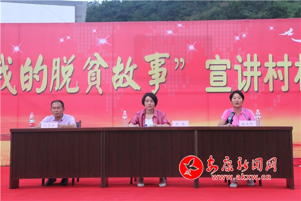 平利縣長安鎮黨委副書記、駐金沙河村工作隊隊長吳琴,講述了她帶領扶貧工作隊在金沙河村,通過道德評議樹“榜樣”治“懶病”的故事,她說:“思想的貧困是貧困的根源,提振志氣、增強信心,重塑對生活的希望是從根源消除貧困的必備良方。”白河縣倉上鎮裴家村致富能手柯昌全,講述了他自身是如何從“二混子”轉變成“自強標兵”的歷程,他還勸誡鄉親們說:“貧困不可怕,只要有志氣、有信心,不等不靠,一定會擺脫貧困,過上幸福美滿的生活。”旬陽縣婦聯干部、駐城關鎮李家坪村第一書記南文珍用真切的話語,講述了自己三年來的駐村扶貧工作經歷,用一個個感人的故事,體現了基層扶貧干部為脫貧攻堅付出的艱辛努力。