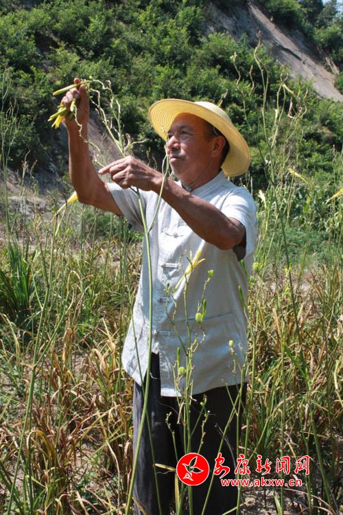 邊介紹著趙德友轉身拿來草帽,引著記者前往“讓他高興”的一畝二分地黃花地,邊走邊說:“今年黃花菜還沒有進入豐產期,所以自家也種了玉米、花生等作物,有時候也忙不過來,我和老伴兒呢,早上4點多就起床,不到5點就打著手電到地里除雜草、防蟲。想著明年才能到豐產期,也就沒怎么施肥,但沒想到今年6月開始黃花盛開,想著老兩口就能摘得過來,沒想到了后來不得不找鄰居幫忙摘花。”