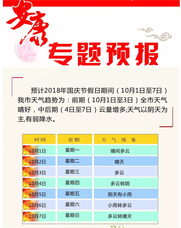安康市氣象臺9月29日日發布國慶假日天氣預報,預計2018年國慶節假日期間(10月1日至7日)我市天氣趨勢為:前期(10月1日至3日)全市天氣晴好,中后期(4日至7日)云量增多,天氣以陰天為主,有弱降水。