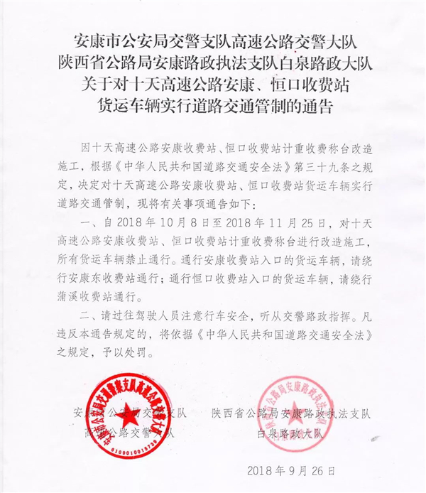 因G7011十天高速白泉段安康收費站、恒口收費站計重收費稱臺陸續改造施工,施工期間兩處收費站貨運車輛通行將受影響,現就施工期間貨運車輛交通管制信息通告如下: