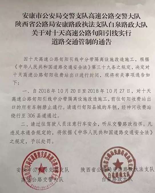 關于對十天高速公路旬陽引線實行道路交通管制的通告