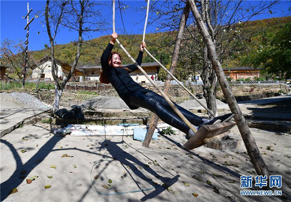 10月29日,漢濱區(qū)茨溝鎮(zhèn)西溝村村民屈南方在村子的小廣場上蕩秋千。 新華社記者邵瑞攝