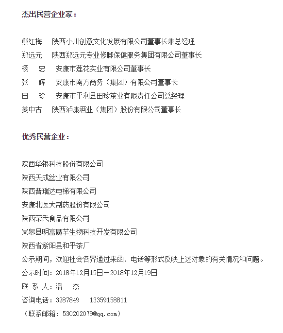 安康新聞網訊 經市委同意,現將我市擬推薦陜西省杰出民營企業家和優秀民營企業名單公示如下: