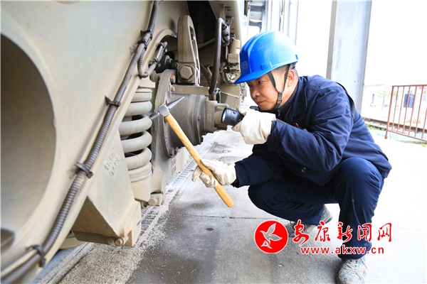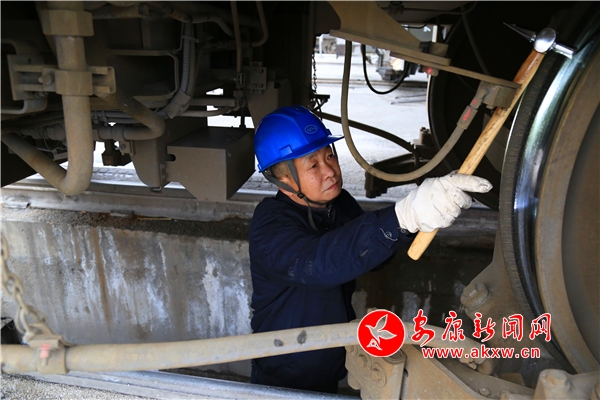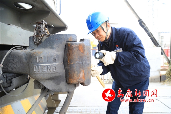 他中等身材,頭戴藍色安全帽,右手拿檢車錘,左手持攝像手電,如同文物品鑒師一般,一厘米、一厘米掃描,生怕錯過什么似的,時而弓步、時而馬步、時而側步,對作業范圍仔細查看,這已是他職業生涯的第30個春運。