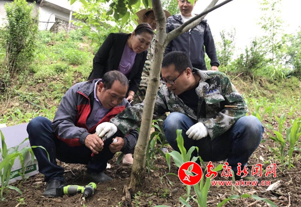 日前,高橋鎮雙龍村的核桃園里來了一群特殊的客人。他們沒有白大褂,而是一身迷彩的科技工作人員。手里拿著電鉆、針劑蹲在核桃樹下給村民示范講解技術要領。“對著果樹的根部,用電鉆斜角打孔2公分左右,剪掉針劑的頭,然后把針插進去就好了”。“嘿!這個辦法好,簡單唆!”,村名劉永宣說到。交談中得知,劉永宣今年70歲了,家里有兩畝核桃,三四年都沒有收成。看著掛著果子,不是黑咯!就是提前掉落。以前給核桃樹打藥奏背個藥箱噴一哈,可奏是么得啥效果。眼瞅著好好的果樹,就是變不了錢,他也著急。