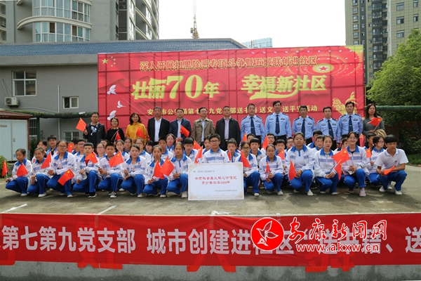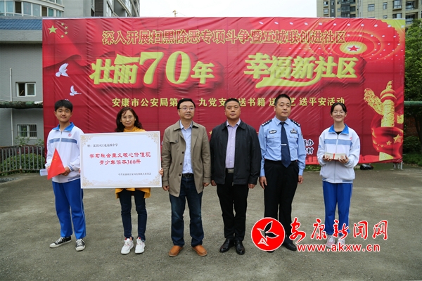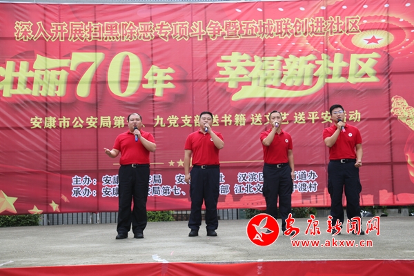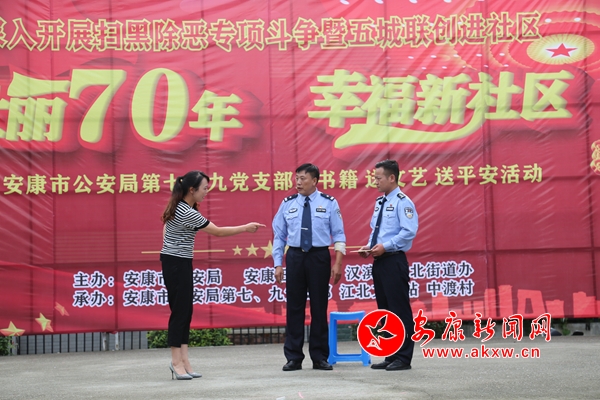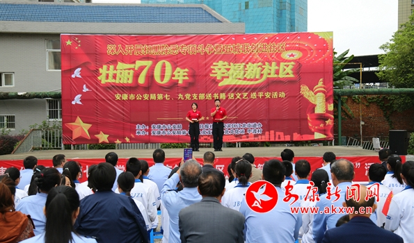 本網訊 (通訊員 周瑞儒)壯麗70年,幸福新社區。在新中國成立70周年即將來臨之際,9月21日上午,市公安局機關第七、第九黨支部深入漢濱區江北辦事處中渡社區,開展掃黑除惡專項斗爭暨“五城聯創”進社區“送書籍、送文藝、送平安”活動。市公安局、市創建辦、安康日報社、江北街道辦事處相關負責人,市公安局機關第七、第九黨支部全體民警輔警,市公安局創建辦、漢濱分局江北派出所負責人,江北高級中學學生代表、社區群眾200余人參加活動。