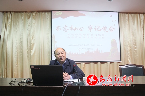 本網訊 10月10日晚上7點,安康市中心醫院召開“不忘初心、牢記使命”主題教育專題黨課,醫院黨委書記、院長陳文乾以“牢記行政后勤初心使命,實現區域醫學中心目標”為題,從“牢記醫院行政后勤初心使命、當前行政后勤存在的主要問題、做好新時期醫院行政后勤工作”等三個方面進行專題黨課輔導。院領導班子成員、行政職能后勤人員200余人聆聽了黨課。副院長董根文主持專題黨課。