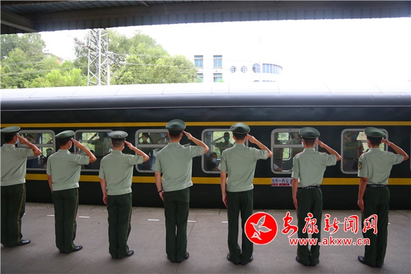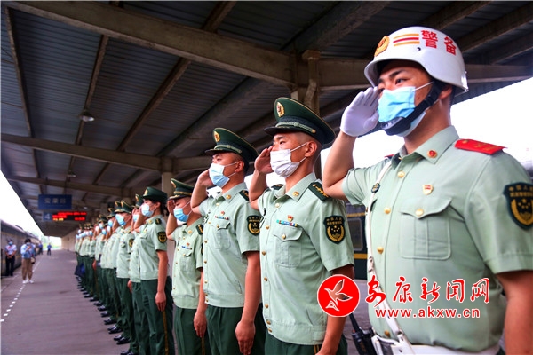 一雙雙緊握的手、一個個深情的擁抱、一對對浸透淚水的眼睛和最后一次的敬禮,無一不訴說著戰友之間無限的眷戀。伴隨著汽笛聲響起,火車緩緩前進,退伍老兵們帶著支隊領導的囑托和戰友的祝福,揮淚告別,送行官兵列隊敬禮,向老兵們表達最后的敬意。