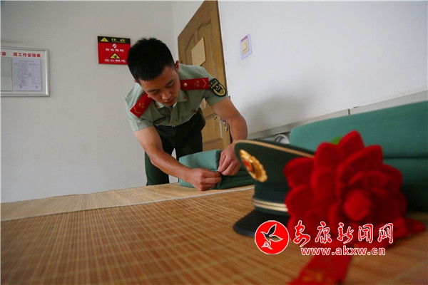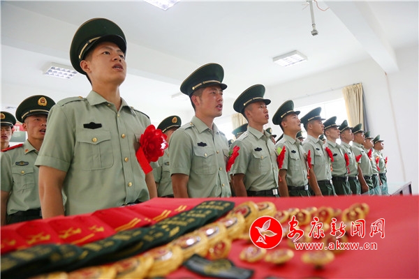“為滿服役期士兵卸軍銜……”離隊前,留隊戰友為退伍老兵卸下警銜、領花、帽徽和胸標,為他們戴上“光榮花”。此時此刻,訓練場上的汗流浹背、執勤路上的日曬雨淋、比武場上的斬金奪銀、戰友之間的情同手足,一幕幕,一幀幀,如此真切,如此清晰,一切的一切都成了最美好的回憶。“我舍不得這心愛的紅肩章、綠迷彩。”退伍老兵馮歡看著卸下的肩章潸然淚下。