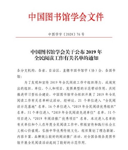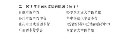 全國16個單位被評為“2019年全民閱讀優秀組織”,其中高校圖書館4個,公共圖書館12個。安康市圖書館在2019年全民閱讀宣傳工作中,積極宣傳和踐行社會主義核心價值觀,弘揚中華優秀傳統文化,組織策劃開展了“全市同讀一本書”、“全市同讀一小時”、“全市同讀一類書”等“全市同讀”系列活動,形成了全市一盤棋的業務格局,充分發揮了市館的“中心引領”作用,深入推進了全民閱讀工作。