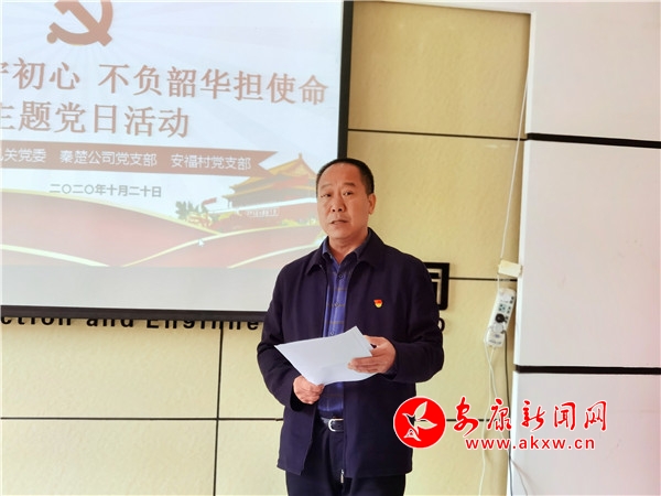 在安康秦楚建設(shè)工程有限公司,市審計局機(jī)關(guān)黨委、安康秦楚建設(shè)工程有限公司黨支部、白河縣安福村黨支部聯(lián)合開展“履職盡責(zé)守初心 不負(fù)韶華擔(dān)使命”主題黨日活動,組織廣大黨員重溫入黨誓詞,傳達(dá)學(xué)習(xí)10月11日市政府黨組(擴(kuò)大)集體學(xué)習(xí)會議精神,秦楚建設(shè)工程有限公司黨支部書記、白河縣城關(guān)鎮(zhèn)安福村支部書記、市審計局機(jī)關(guān)黨委專職副書記3名黨員作交流發(fā)言;顒幼詈,市審計局黨組書記、局長周慶意對此次活動進(jìn)行現(xiàn)場點評。