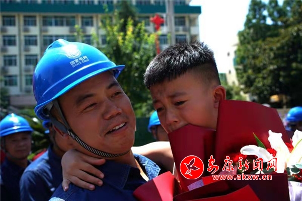11時許,搶險車隊在漢濱騎警的護送下,緩緩駛入公司門口,在陣陣掌聲中隊員們依次走下搶險車,他們個個精神飽滿、笑容燦爛。“熱烈歡迎國網安康供電公司抗洪援豫突擊隊的英雄勝利歸來!”“英雄們辛苦了!”……在儀式現場,迎接人員為公司突擊隊隊員們拉起橫幅、鼓掌歡呼。