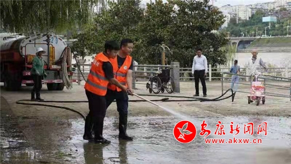 隨著江水回落,漢江公園部分人行步道和公園場地逐漸露出水面,步道上殘留著大量浪渣和堆積的淤泥。黨員及工人們不畏困難,揮舞著鐵鍬、鐵鏟清除淤泥,借助灑水車高壓水槍沖洗地面,一個個干勁十足,用實際行動踐行共產黨員的責任與擔當。
